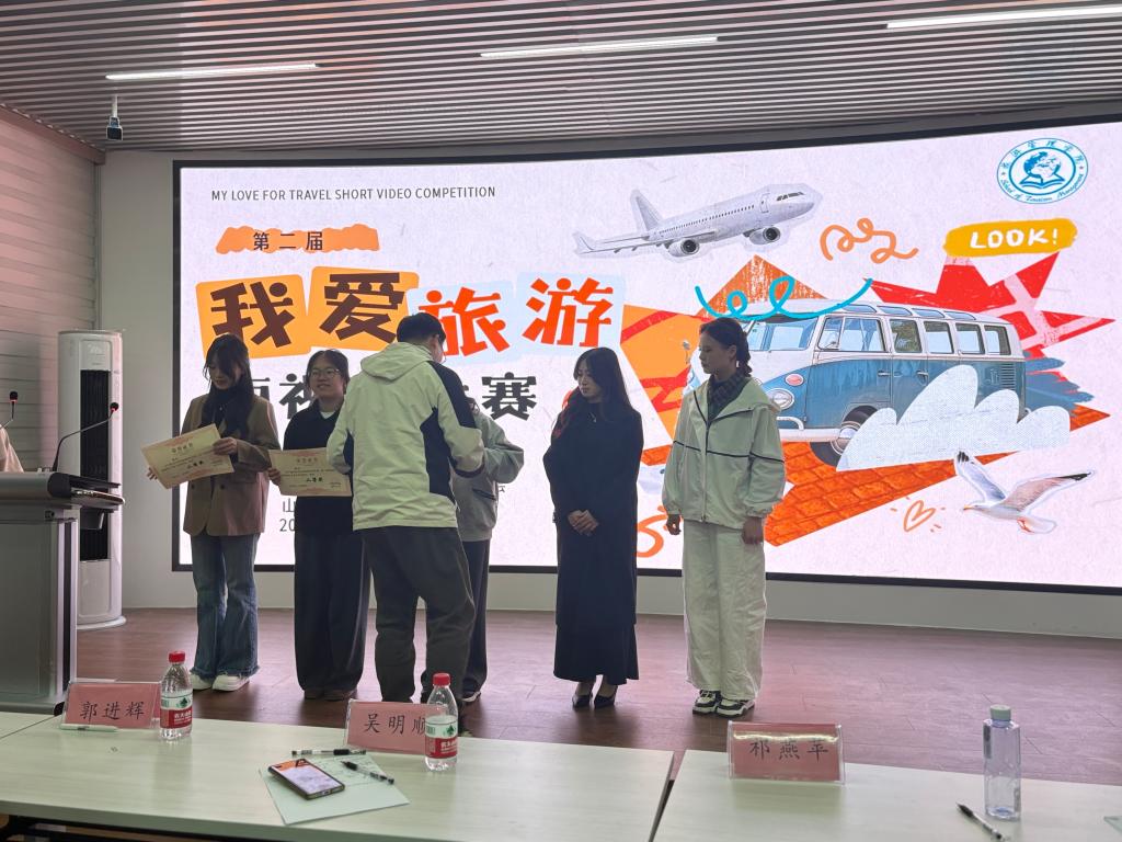 经过激烈角逐,大赛最终产生一等奖 3 名、二等奖 5 名、三等奖 6 名、优秀奖 5 名,评委老师们为各获奖队伍依次颁奖。评委老师肯定了参赛作品的创意与水准,鼓励学子以镜头记录美好,深耕旅游专业学习,在行走与创作中感悟旅游的魅力。
