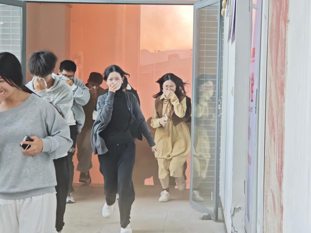 下午4点整,伴随消防应急广播,几股“浓烟”在逸夫楼实训楼滚滚升起,在各楼层应急疏散引导员的指引下,个个大一新生手捂口鼻,低姿弯腰,按指定逃生路线有序从容地从应急疏散通道跑出。