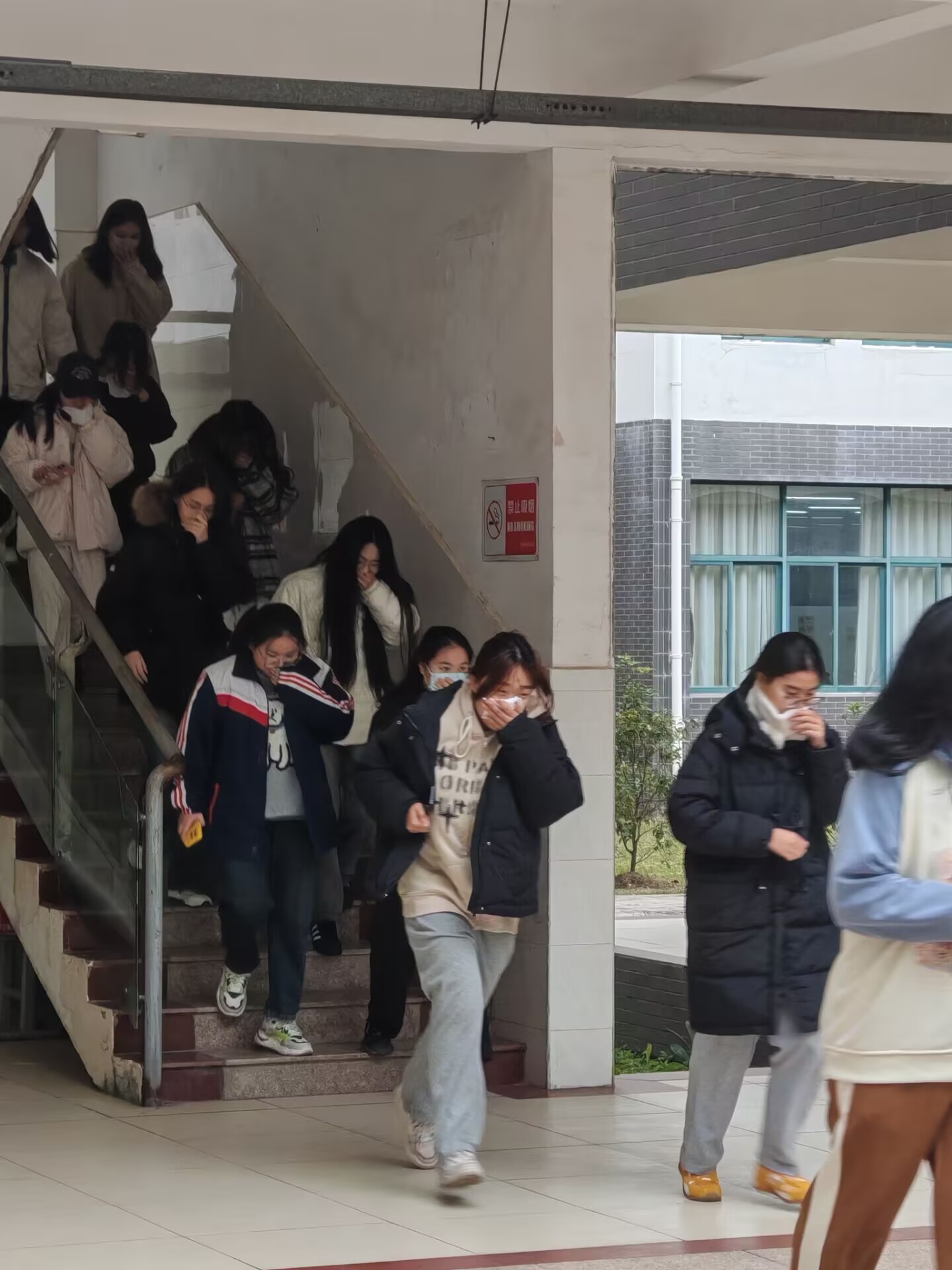 随着燃放烟雾弹的燃放和预警警报声的响起,全院师生在工作人员的引导下,弯腰、捂鼻,快速、有序地撤离到指定安全区域。整个应急疏散演练紧张而有序,师生们表现出良好的应急反应能力和组织纪律性。通过此次活动,持续推动消防安全深入人心,筑牢学院生命安全防线。