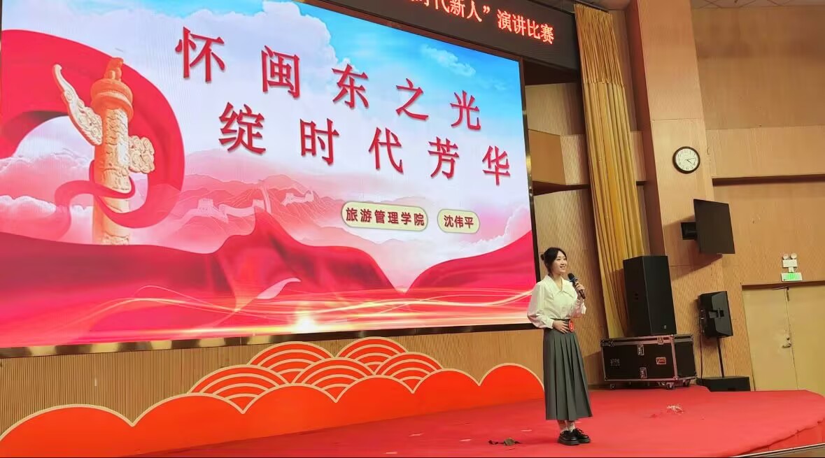 为了认真贯彻落实习近平总书记关于关心下一代工作的重要指示批示精神,坚持用习近平新时代中国特色社会主义思想铸思想重要孕育地和实践地的责任担当,大力弘扬闽东之光,落实立德树人的根本任务。由宁德师范学关工委主办的“弘扬闽东之光、传承红色基因、争做时代新人”主题演讲比赛于3月29日下午在校图书馆报告厅落下帷幕。公司2024级旅游管理与服务教育专业沈伟平同学以其的出色的表现荣获校级二等奖。本次演讲比赛汇聚了各二级学院优秀青年学子,沈伟平同学以饱满的热情、深刻的思考和流畅的表达,展现了旅游学子积极向上的精神风貌和良好的语言表达能力,赢得了评委与观众的一致认可,充分展现了旅游学子勇于追梦、敢于担当的良好精神风貌。