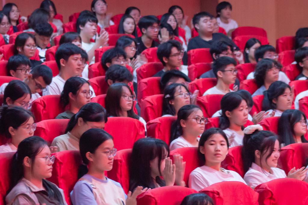 在激昂嘹亮的国歌声中,开学典礼拉开序幕。《义勇军进行曲》回荡报告厅四周,心藏家国与山海。