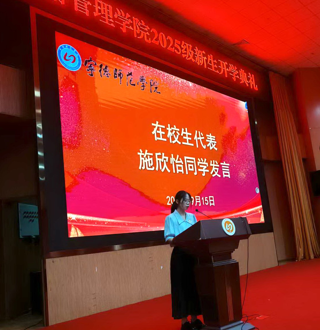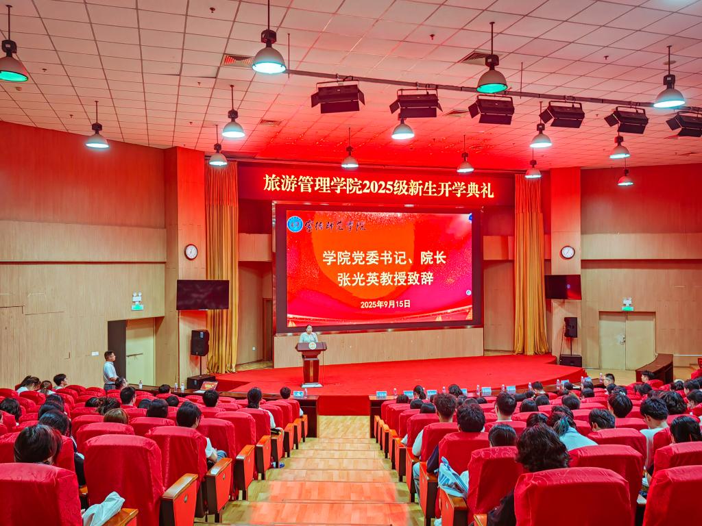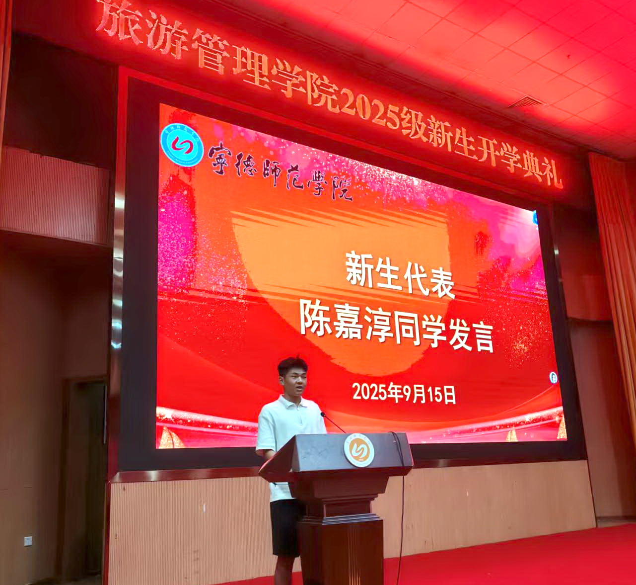 2025级新生代表陈嘉淳同学结合亲身经历,从“山海情怀、文化传承、乡村振兴”三个角度分享了对文旅专业的理解与向往,表达了将以谦逊之心求知、以务实之态践行“崇德、弘毅、厚学、笃行”的校训精神,争做赋能乡村、创新文旅的新时代青年的坚定决心。