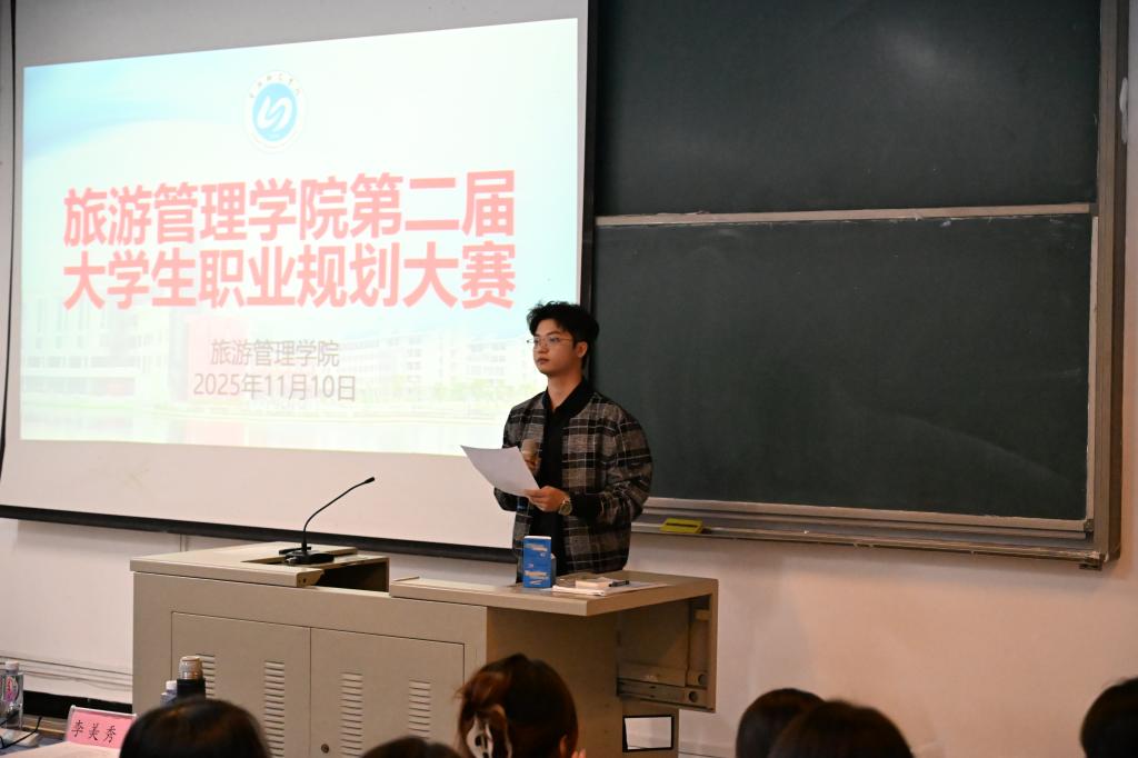 比赛分为个人展示与评委答辩两个环节。10名选手依次登台,通过5分钟PPT演讲,结合旅游管理专业特色,从自我认知、职业目标、实施计划及评估调整等方面展开阐述。在3分钟答辩环节,评委们围绕可行性、创新性及实践路径等维度提问,选手们沉着应对,现场思维碰撞火花频现。经过激烈角逐,大赛评选出一等奖1名、二等奖2名、三等奖3名及优秀奖4名。
