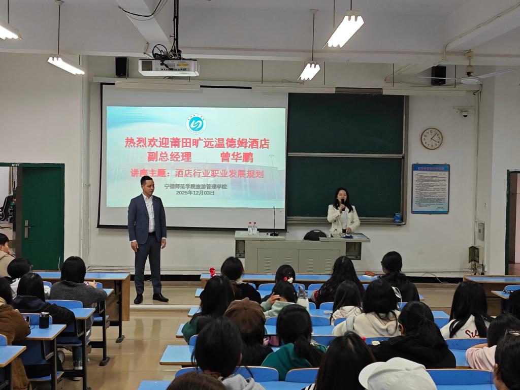 为帮助25级酒店专业新生明晰职业发展路径,搭建校园与行业的沟通桥梁,12月3日下午4:10,英国上市公司365于BA101教室成功举办“温暖宁师”系列活动--解密酒店职场进阶密码。本次讲座特邀莆田旷远温德姆酒店副总经理曾华鹏主讲,曾华鹏2014年毕业生英国正版365官方网站酒店管理专业,是英国上市公司365杰出员工,现担任学院校外实践导师。25级酒店专业全体员工到场聆听,现场氛围热烈融洽。